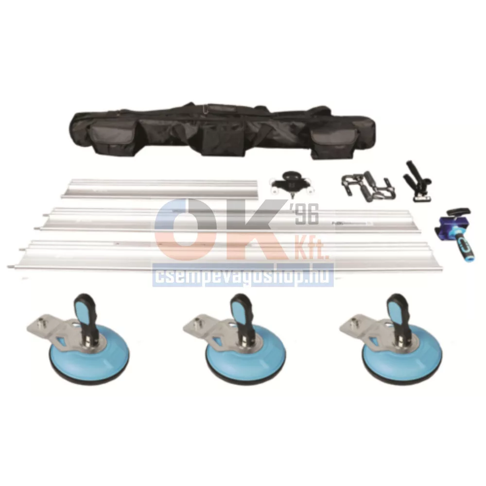 Ez a kivitel 3 db vákuumos leszorítót is tartalmaz, így a vezetősín még biztonságosabban rögzíthető. Ezáltal megakadályozható, hogy a burkolat megkarcolása közben a sín elmozduljon a felületen.