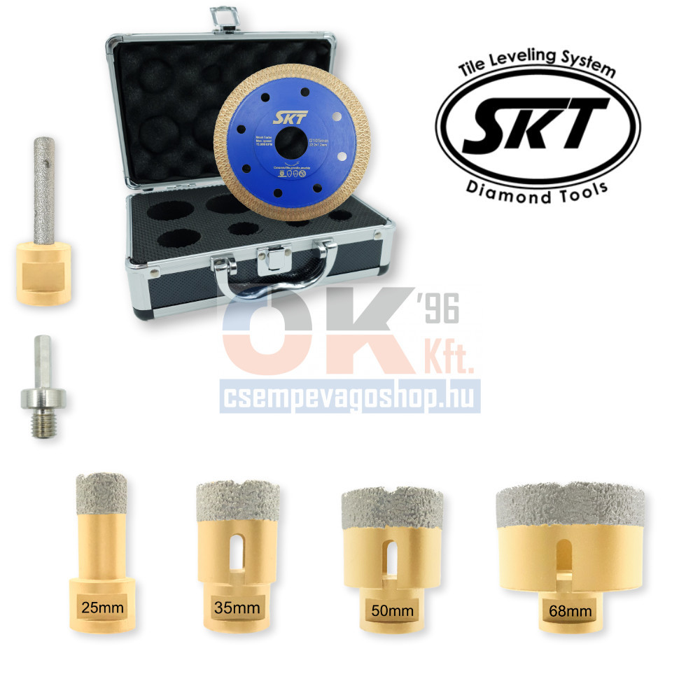 SKT gyémántszemcsés lyukfúró készlet professzionális felhasználásra. A vákuum forrasztással készült gyémánt szerszámok magas minőséggel és hosszú élettartammal rendelkeznek. A készletben található fúrók használhatók kerámia, csempe, gres, kőporcelán, kerlite, neolith, márvány, gránit, mészkő és természetes kövek száraz fúrásához.