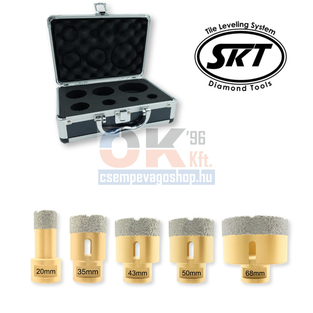 SKT gyémántszemcsés lyukfúró készlet professzionális felhasználásra. A vákuum forrasztással készült gyémánt szerszámok magas minőséggel és hosszú élettartammal rendelkeznek. A készletben található fúrók használhatók kerámia, csempe, gres, kőporcelán, kerlite, neolith, márvány, gránit, mészkő és természetes kövek száraz fúrásához.