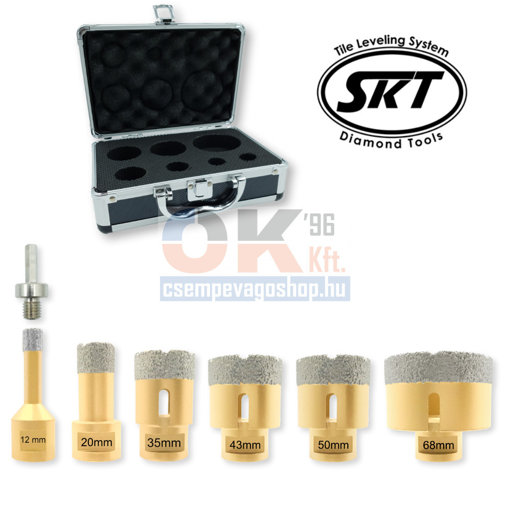 SKT gyémántszemcsés lyukfúró készlet professzionális felhasználásra. A vákuum forrasztással készült gyémánt szerszámok magas minőséggel és hosszú élettartammal rendelkeznek. A készletben található fúrók használhatók kerámia, csempe, gres, kőporcelán, kerlite, neolith, márvány, gránit, mészkő és természetes kövek száraz fúrásához.